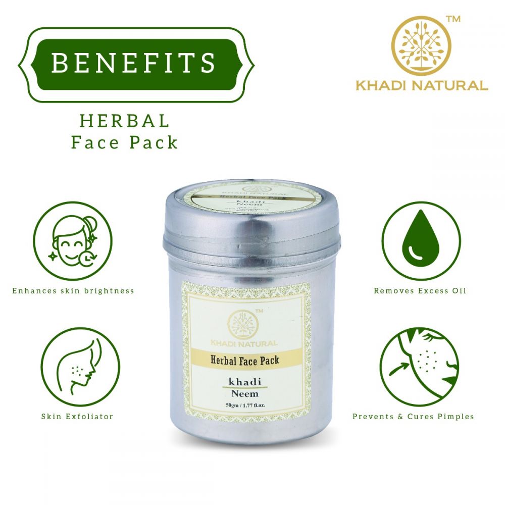 Khadi Natural Herbal Face Pack Neem 50 g är en helt kemikaliefri ansiktsmask som hjälper din hud att bli av med den dagliga uppbyggnaden av toxiner under huden och samtidigt bli av med bakterier och smuts inbäddade i din hud för att ge den en frisk lyster. De olika sorterna av lera samt de noggrant utvalda örtextrakten garanterar funktion och upplevelse. No chemicals!