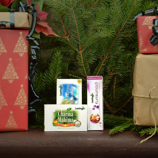 Alla tre produkter från Santhigiri. Två ljuvliga tvålar och en under-eye-cream.
